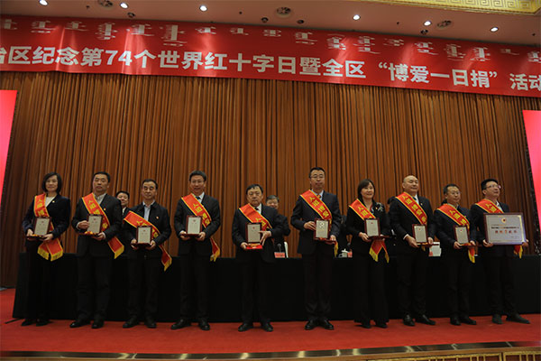 5月8日上午,内蒙古自治区纪念第74个世界红十字日暨全区“博爱一日捐”活动推进会在呼和浩特新城宾馆召开。自治区党委副书记、政法委员会书记林少春主持会议。全国人大常委会副委员长、农工党中央主席、中国红十字会会长陈竺,副会长于福龙,自治区人大常委会副主任廉素,自治区副主席奇巴图,自治区红十字会党组书记、常务副会长王芳出席会议,并为获得中国红十字会表彰的抗击新冠肺炎疫情先进集体、先进个人、优秀志愿者、“全国红十字模范单位”和抗疫捐赠爱心企业颁发奖章奖牌,为 “博爱一日捐”优秀组织地区和单位代表颁发纪念杯。现场还举行了向中国红十字(内蒙古)救护转运队、 内蒙古“健康心”医疗队和新一轮“光明行”医疗队授旗仪式。